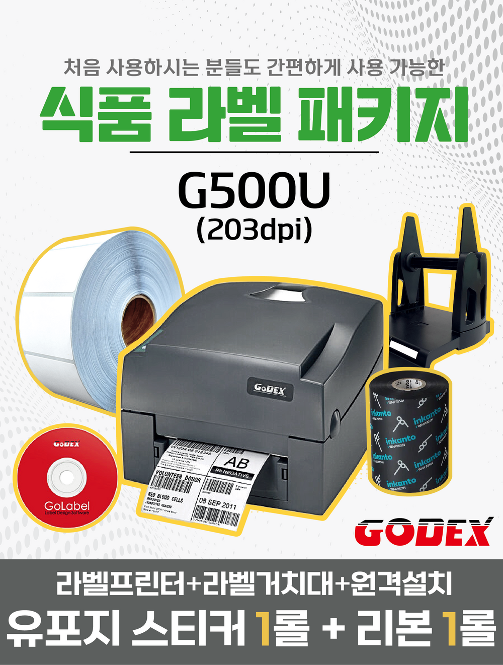 식품 라벨 패키지 G500U 203dpi 라벨거치대+스티커롤라벨+열전사리본+무료원격설치