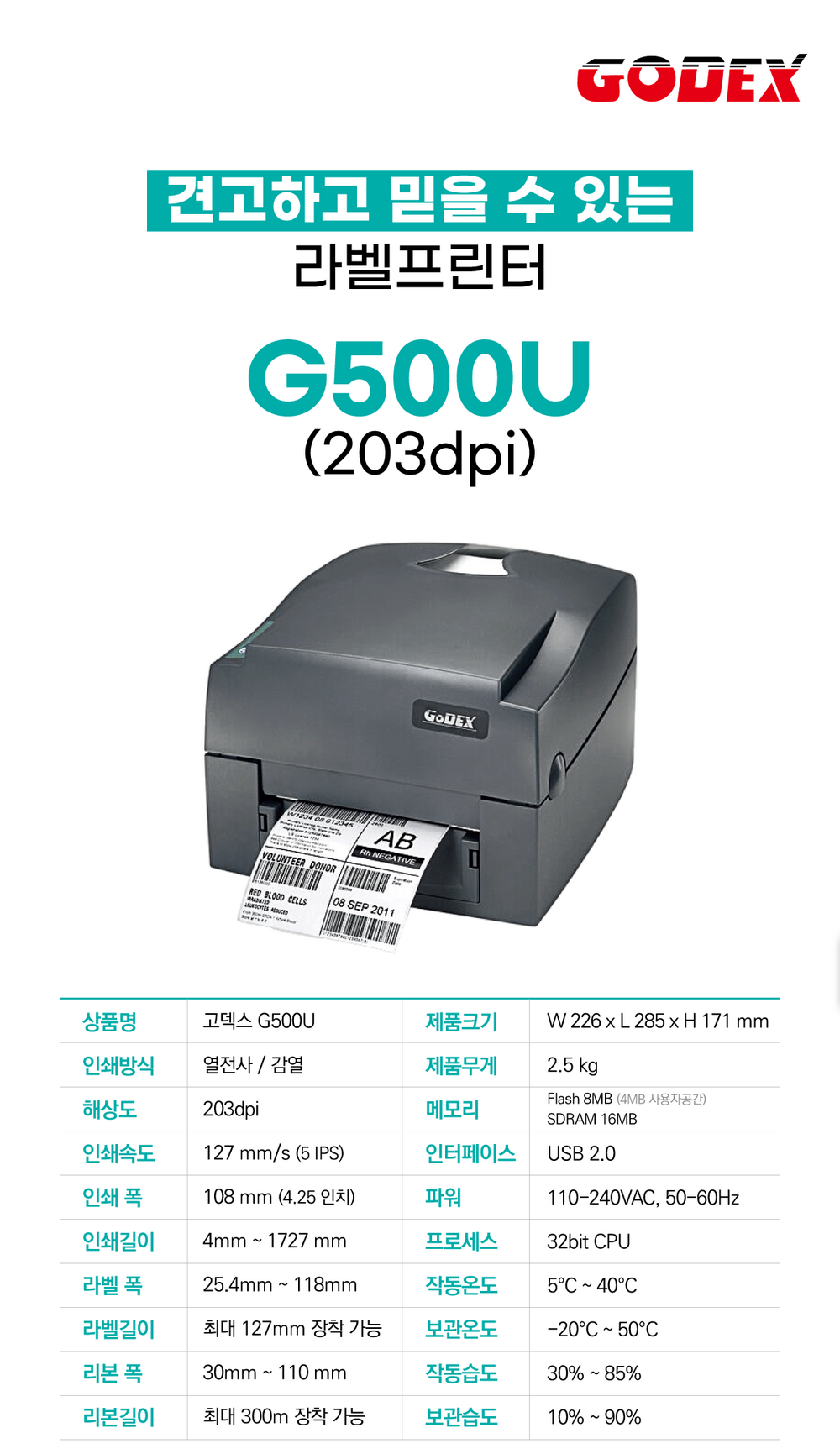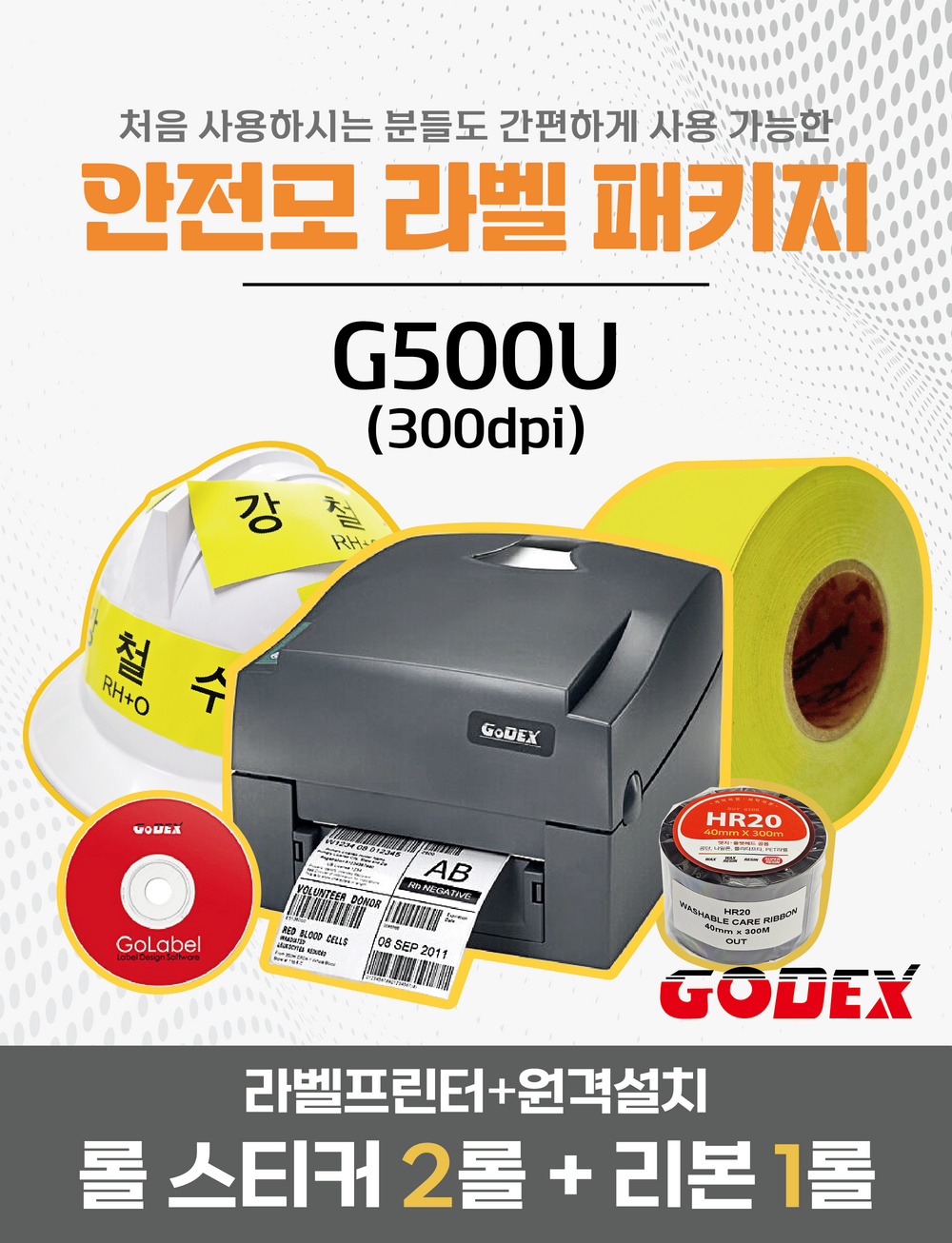 안전모 라벨 패키지 GODEX G500U 203dpi 스티커롤라벨+열전사리본+무료원격설치