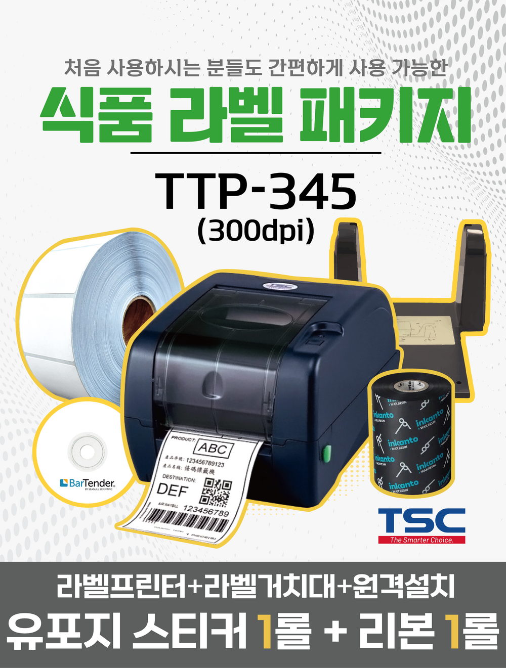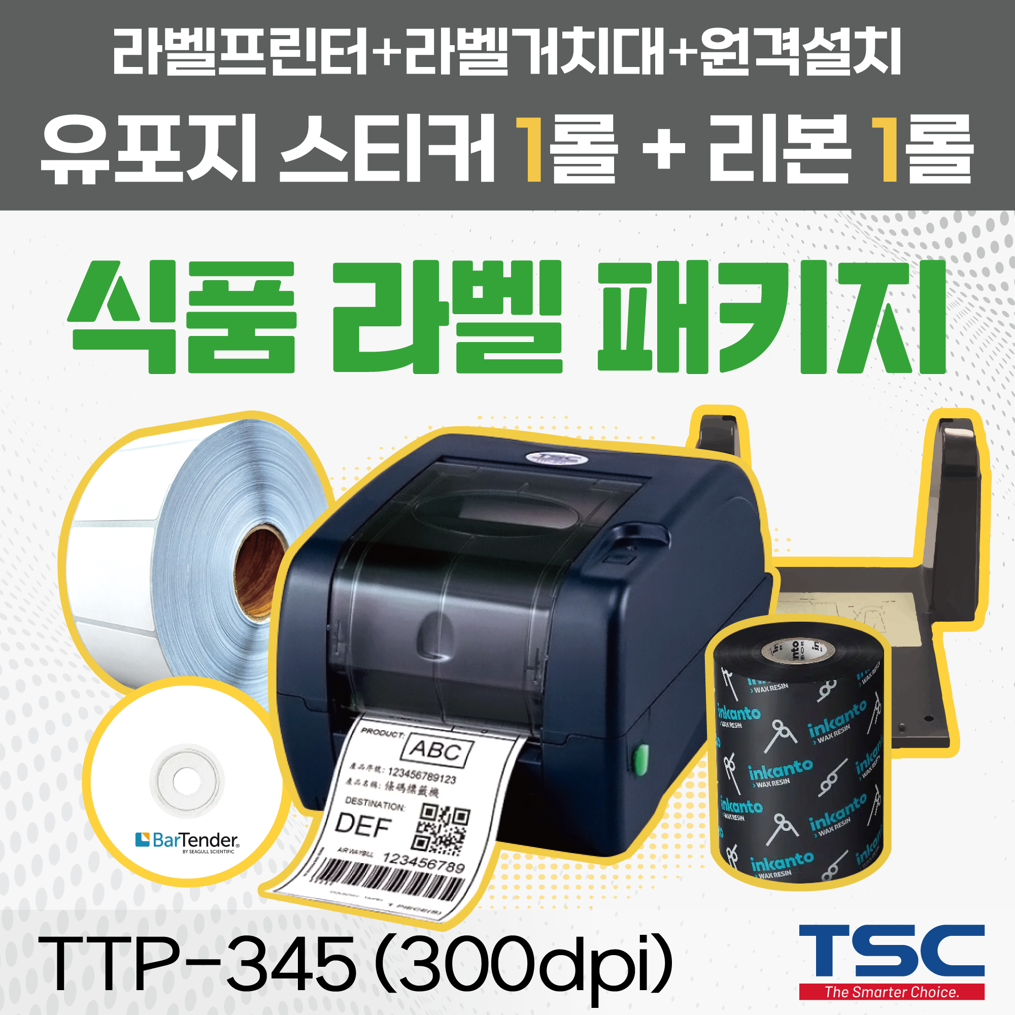 식품 라벨 패키지 TTP345 300dpi 라벨거치대+스티커롤라벨+열전사리본+무료원격설치
