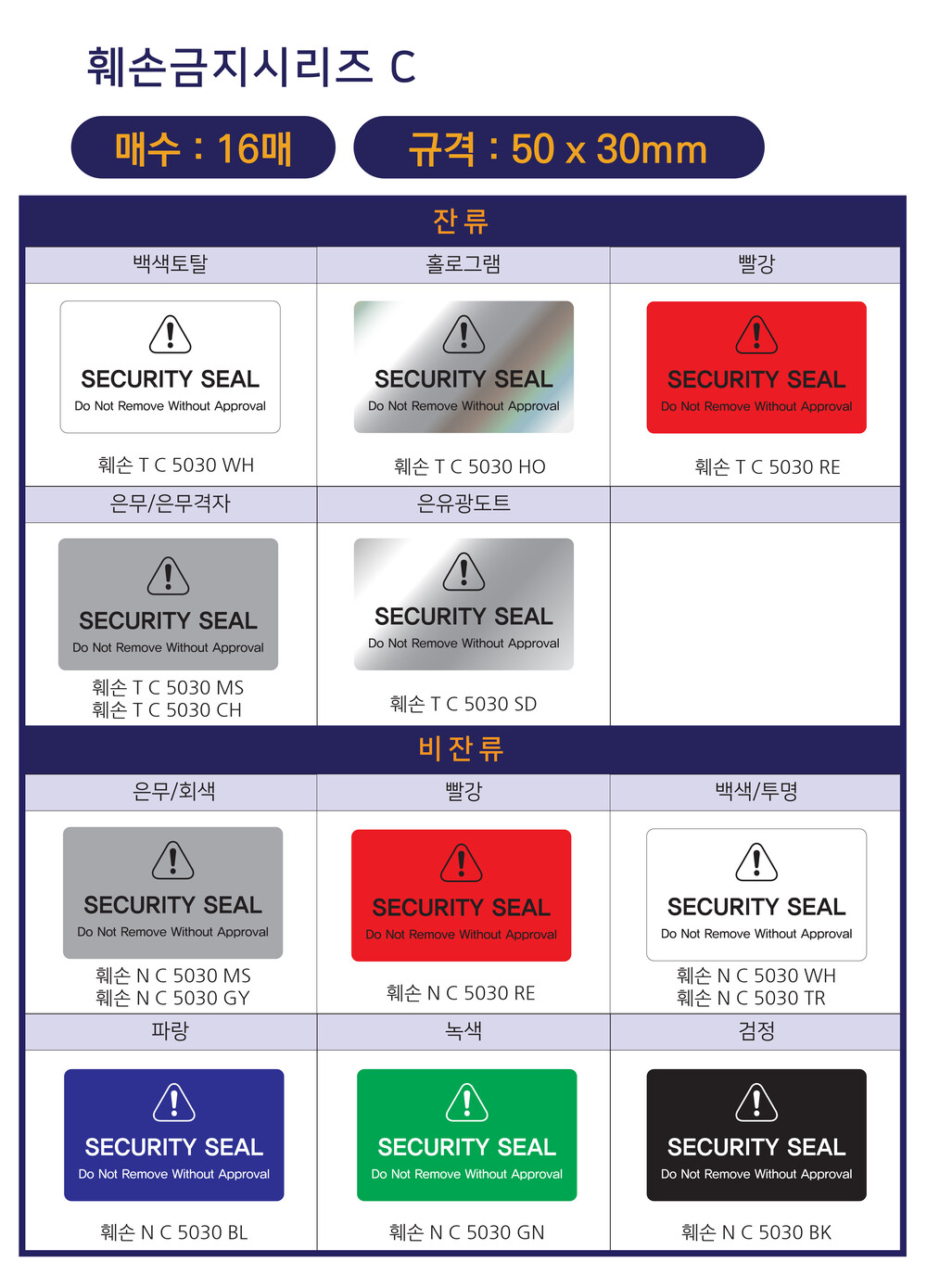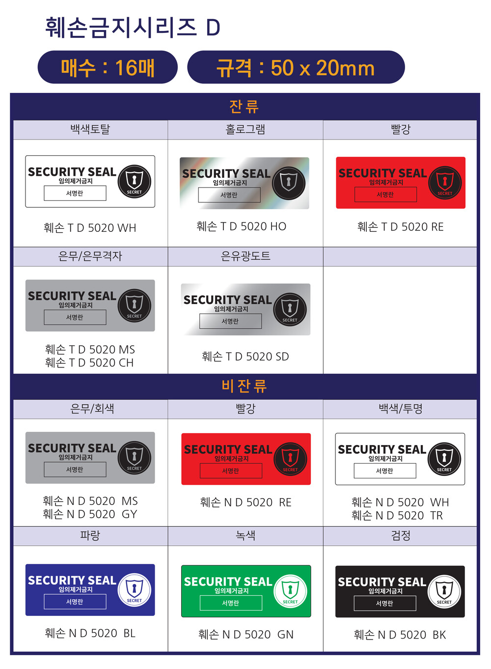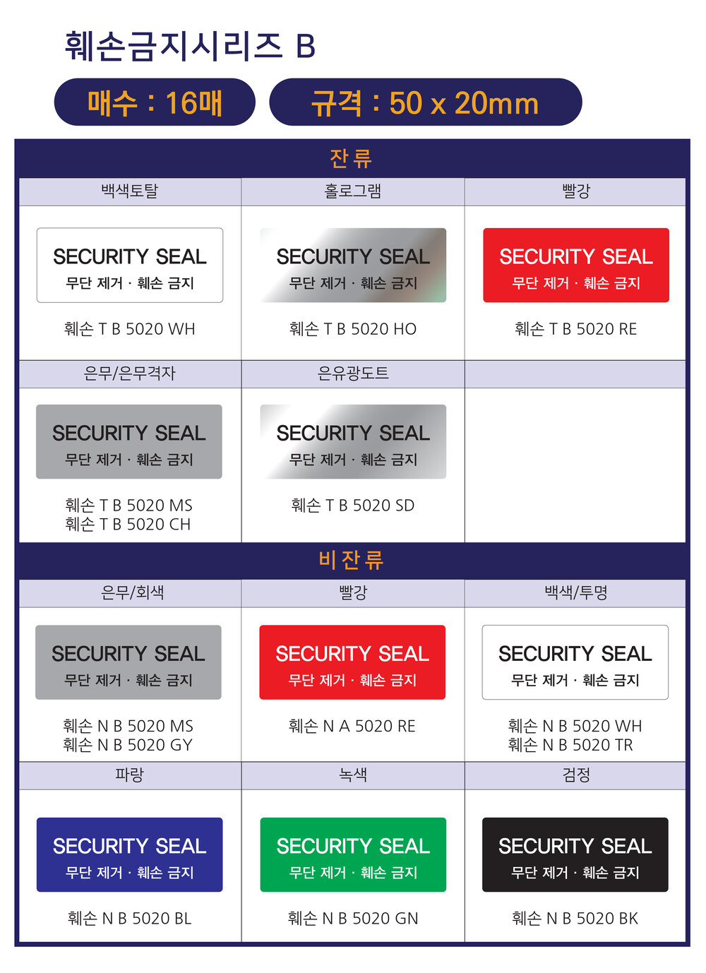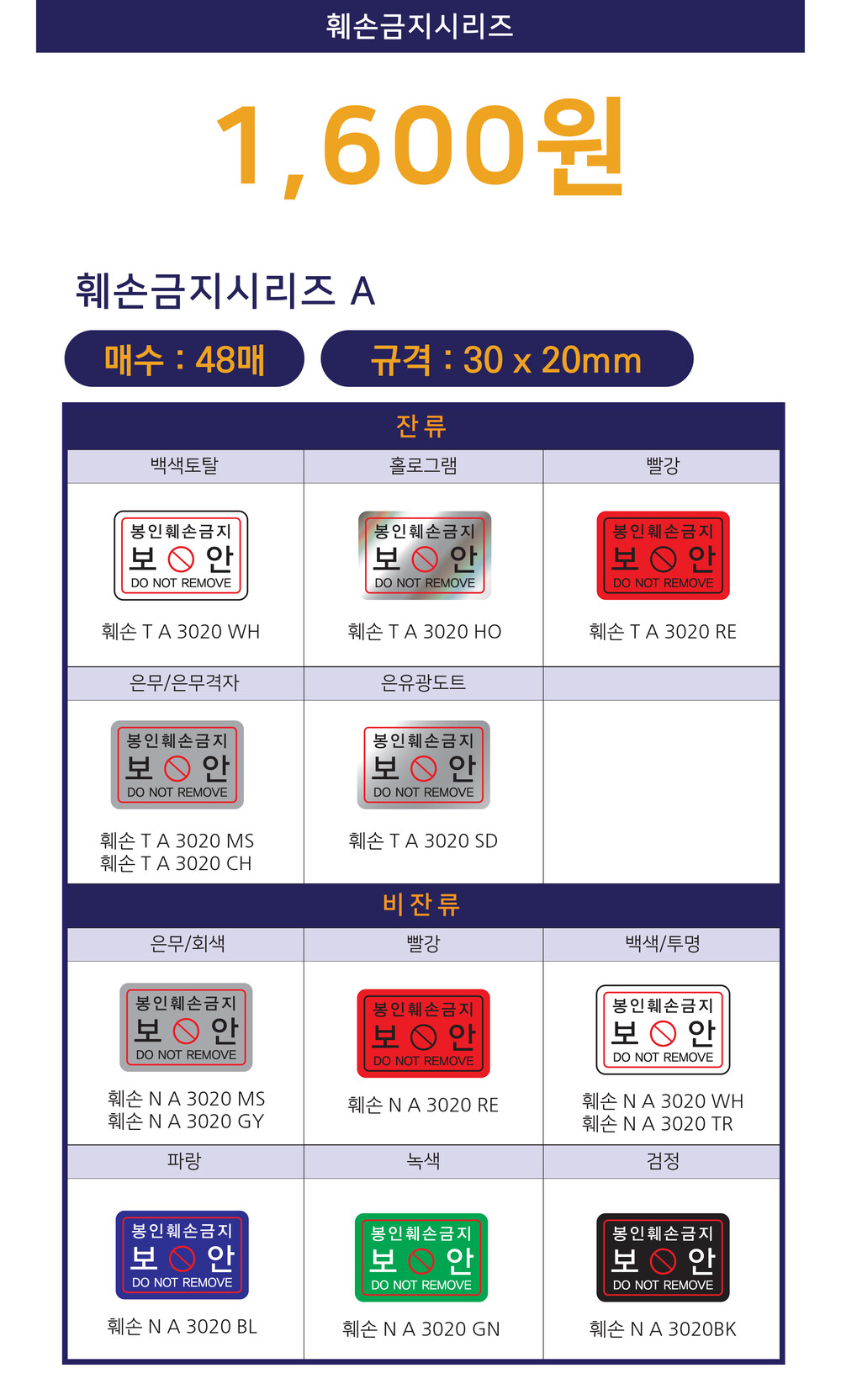 훼손금지 보안 스티커 4가지 스타일 14가지 색상 총 84종