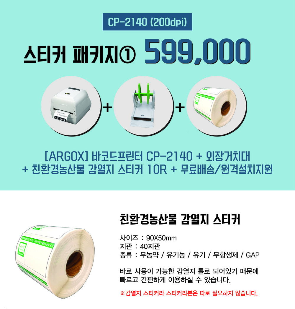 [ARGOX] 바코드 프린터 CP-2140+외장거치대+친환경농산물 감열지 스티커 10R+무료배송/원격설치지원
